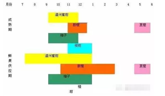我省柑桔的成熟期較為集中,次要在10、11和12月份。此中溫州蜜柑、 椪柑和柚子次要集中在10到12月份,臍橙和椪柑次要集中在11、12和1月份;