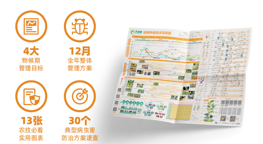 歷時兩年打磨,顛末33位柑桔專家配合研發的精品圖,常識點十分全面。既包羅病蟲害速查,缺素癥狀對照,還包羅柑桔全年植保辦理工做計劃。實是一張種柑桔人必備的寶典。
